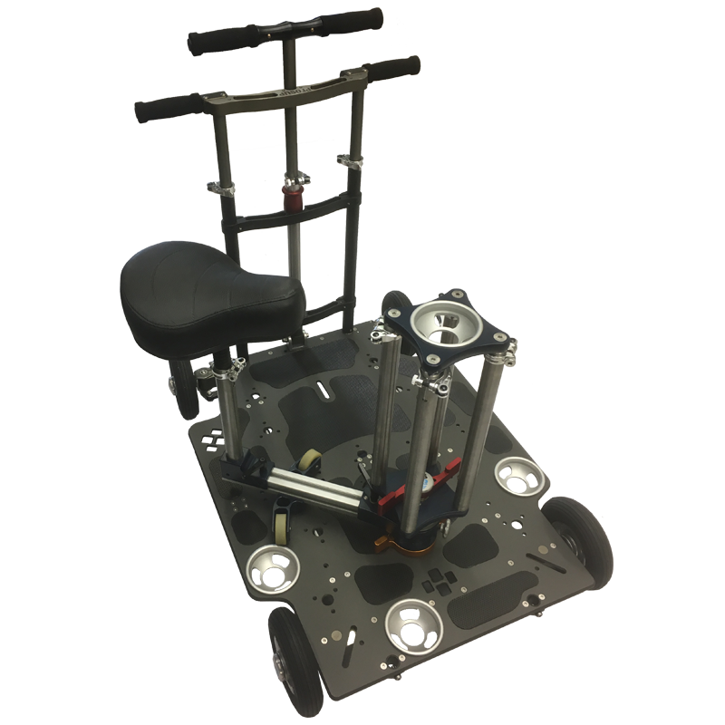 The Prosup Swivel has been designed specifically to work with the Lap Top- and Jem Dolly. The unit is attached to the LapTop's Euroboss (supplied with the camera dolly). The wheels under the seat pole absorb the weight of the operator whilst allowing easy circular movement around the level riser which support the users pan & tilt head. The seat pole is easily adjusted by means of a locker lever. A convenient lever locks the rotation of the seat swivel to a static position.